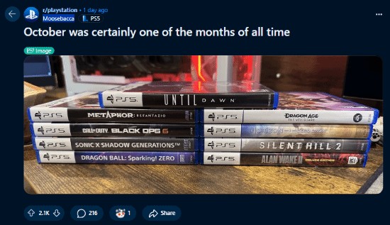 日前,Reddit社区网友@Moosebacca晒出了他十月份在PS5游戏上面的开销,图片中展示了《直到黎明重制版》《零之曙光复刻版》《寂静岭2重制版》《心灵杀手2高级版》《龙腾世纪4》《暗喻幻想》《黑色行动6》《七龙珠 电光炸裂!ZERO》《索尼克×夏特 世代重启》足足九款PS5实体版游戏,售价在600美元上下(约4263元)。