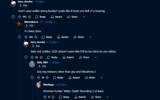 除了热烈讨论哪些游戏值得购买外,也有网友好奇这位玩家是否已经“囊中羞涩”,对此,@Moosebacca坦言自己确实有点买多了,笑言自己的钱包感受到了不小的压力。同时,还有玩家提醒他,2025年将会有《GTA6》《怪物猎人:荒野》《死亡搁浅2》等更多大作发布,显然又将进入一轮“买买买”的节奏。