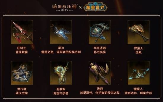 联动武器幻化外观共有8件,分别为狂骑士-蕾茉妮雅、武行者-诸天之拳、死灵法师-影之哀伤、野蛮人-血吼、雾刃-雷霆之怒,逐风者的祝福之剑、圣教军-真理守护者、法师-埃提耶什,守护者的传说之杖以及猎魔人-索利达尔,群星之怒。玩家将优先获得本职业武器外观,后续在不转职的情况下可随机获取其他职业武器外观。