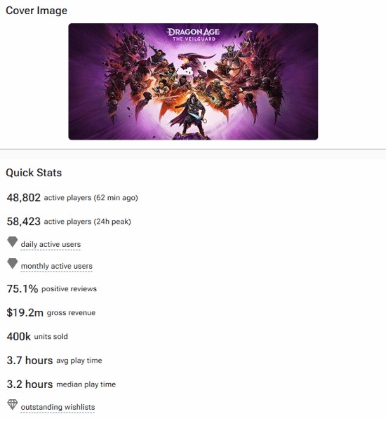 除此之外,《龙腾世纪4:影障守护者》在Steam里的玩家峰值仍旧停留在几天前89418人的记录。