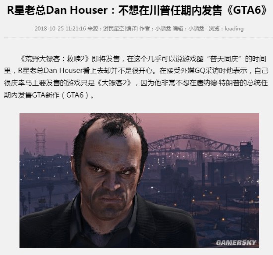 2018年,Rockstar联合创始人Dan Houser接受采访时表示,他很高兴工作室的下一款作品是《荒野大镖客2》,因为他不想在特朗普任期内推出《GTA6》。但令人哭笑不得的是,在《GTA6》即将发售之际,特朗普又要当选总统了。