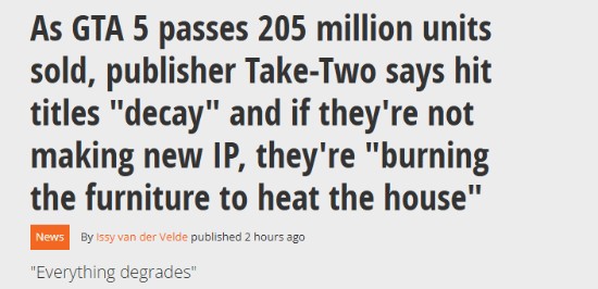 可能在玩家看来,Take-Two通过年货游戏《NBA 2K》《WWE 2K》以及《GTA OL》的更新内容在自己的“舒适圈”就足够赚取丰厚利润。但泽尔尼克在会议上表示“人类生活和地球上存在的一切事物最终会慢慢衰变,包括热门作品。因此,如果我们不尝试新事物和创造新的IP,那么‘安于现状’都不足以形容我们,说严重点就是在‘烧毁家具来取暖险’。”