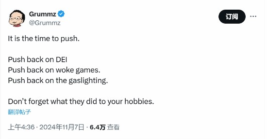 近日,外网博主@Grummz在社交媒体上发布了一条帖子,呼吁游戏玩家们对“DEI内容”做出反击。他在帖子中写道:“是时候反击了。反击DEI,反击觉醒游戏,反击洗脑宣传。别忘了他们对你的爱好所做的一切。”