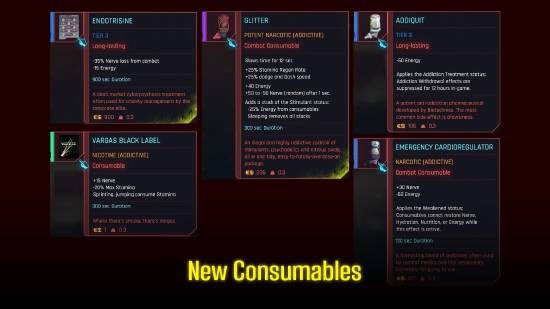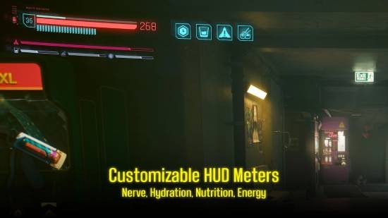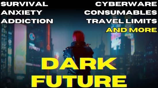 《赛博朋克2077》主角V被植入生物晶片战斗表现超出人类极限,撇开神机错乱症状不谈,玩家操作时几乎能全年无休(除因应剧情睡觉快转),不会因为口渴、精神耗弱、饥饿、精神崩溃而死。而“黑暗未来”加入口渴(Hydration)、营养(Nutrition)、活力(Energy)与意志值(Nerve)等四大基本生理需求,以及全面的城市生存游戏玩法。