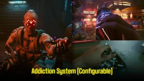 本MOD除了追加生理需求、新速骇芯片、改造装置、车子、自订介面,也设有“成瘾”及“受伤”系统。启动受伤机制后,角色累积一定的伤害会出现受伤状态,降低所有治疗物品的使用效果,玩家能关闭或调整触发机率。