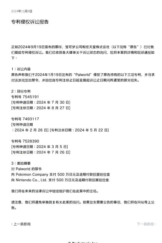 任天堂正式宣布《幻兽帕鲁》开发商Pocketpair侵犯了3项专利,要求Pocketpair停止发售《幻兽帕鲁》并赔偿任天堂和宝可梦公司各500万日元。Pocketpair表示,其将在未来的法律诉讼里继续维护自己在本案里的立场,如果未来有需要公告的事项,将会在网站里公告,一起来看下。