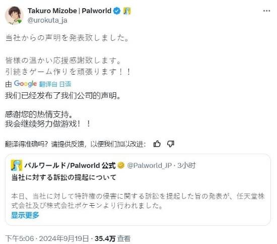 在9月份,任天堂联合宝可梦公司宣布共同起诉《幻兽帕鲁》开发商Pocket Pair,指控后者侵犯了任天堂的多个专利,要求停止侵权行为并给予赔偿,随后《幻兽帕鲁》开发商社长沟部拓郎也曾发推回应了这次起诉事件,他表示:“我们已经发布了公司的声明。感谢您的热情支持,我会继续努力做游戏!”