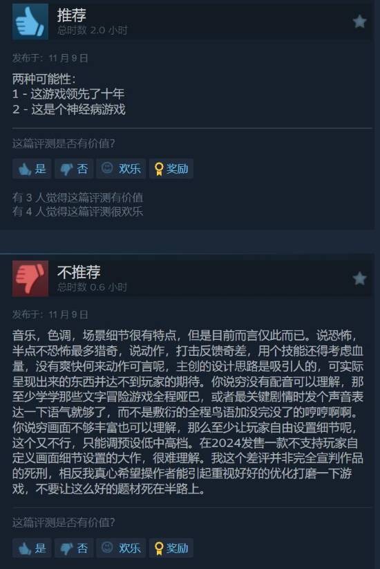 尽管游戏很有意思,有令人眼前一亮的优点,但整体体验下来缺陷也不少,很多玩家认为198元的定价不太合理。有给出“不推荐”的玩家表示:“我这个差评并非完全宣判作品的死刑,相反我真心希望操作者能引起重视好好的优化打磨一下游戏,不要让这么好的题材死在半路上。”