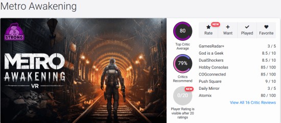 媒体评分方面,本作获得了OC站80分,M站均分76分的成绩。媒体们普遍表示《地铁:觉醒》是最具沉浸感的VR游戏之一,游戏里的亮点较多,从而让自己愿意再次重玩整款游戏,但《地铁:觉醒》略显缓慢,故事展开需要一定时间,并且有些场景由于“过于真实”,可能会给玩家带来压力。
