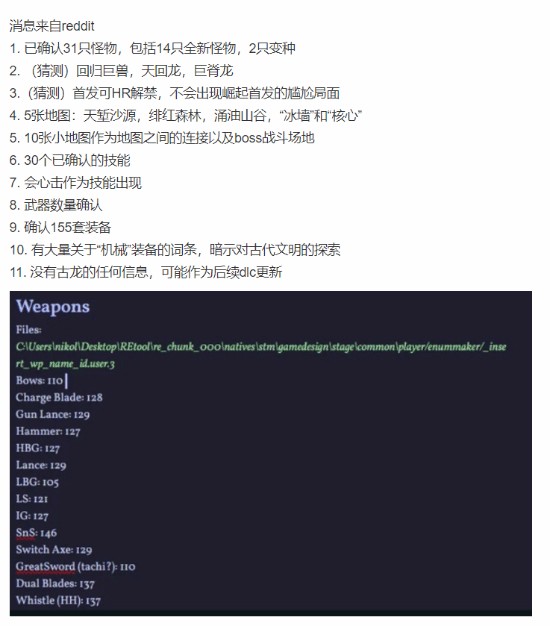 《怪物猎人:荒野》公开测试现已结束,但玩家们对于本作的讨论依旧热烈。根据贴吧网友消息称,近日国外论坛Reddit上有人解包出了本作中大量内容,包括31只怪兽、5张大地图、10张小地图以及155套装备等。