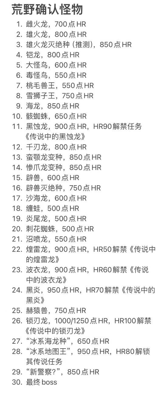 值得一提的是,列表中提到了本作出现的全新怪物种类“灭绝种”。此前在采访中藤冈要先生谈到“灭绝种”时曾提到:“灭绝种仅仅只是指代在《荒野》的时间线上被认为已经灭绝了的物种。不管是古龙种还是什么种,只要他们灭绝了就是灭绝种。也不是说以后在游戏中会出现非常多灭绝种的怪兽。就是说那些认为已经灭绝了的怪物,难道其实还没有灭绝,还有存活下来的个体……!?”