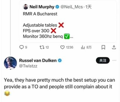 完美世界为中国首个major的投入也相当之大:比赛用机的配置均为4080显卡+AMD 7800X3D。但依然有国外的职业哥如此抱怨:“AOC显示器,桌子高度不能调节,呵呵了。”另一位职业选手dexter也有类似吐槽,表示桌子高到自己得往椅子上垫好几层垫子才行。