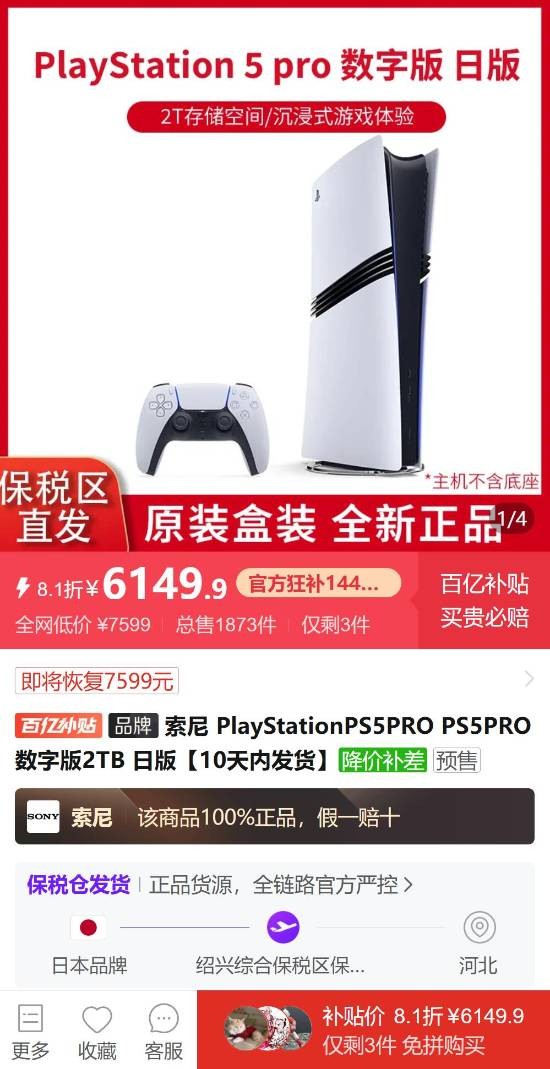 索尼PS5 Pro在不久前上市,虽然首发也迎来了一波第三方涨价热潮,但并没有那么坚挺,自那之后价格一直持续走低。今日在拼多多百亿补贴频道,日版PS5 Pro的价格已来到了6149.9元的价格,而昨天还是6200元。