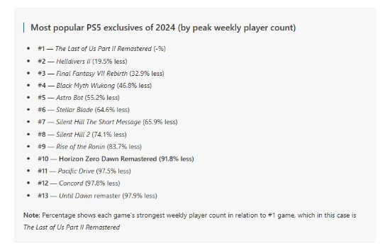TrueTrophies汇总了350万PSN账户的游戏数据,发现在今年推出的13款PS5独占(还登陆了PC)游戏中,《地平线:零之曙光 重制版》的周玩家数量排名第10,表现不尽人意。从图表里可以看到,顽皮狗的《最后生还者2:复刻版》表现较为出色,击败了《地狱潜者2》、《最终幻想7:重生》等一系列游戏。