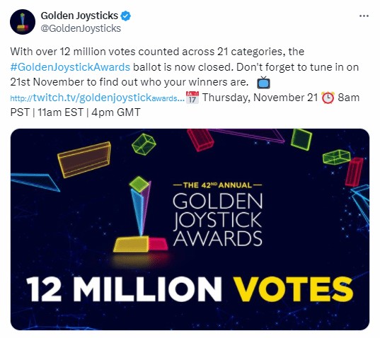 金摇杆官方宣布,全部21个奖项投票总数已超过1200万张。投票结果将于11月22日的颁奖典礼直播上正式公布。