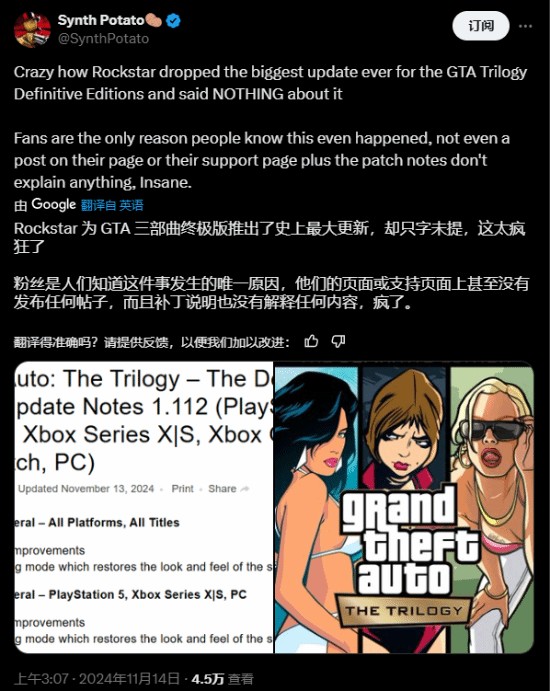 近日游戏博主@SynthPotato吐槽了R星对于本次更新的冷淡态度:“R星为《GTA三部曲》推出了史上最大更新,却只字未提。他们的页面或支持页面上甚至没有发布任何帖子,而且补丁说明也没有解释任何内容。粉丝的口口相传是人们知道这件事的唯一途径,这太疯狂了。”