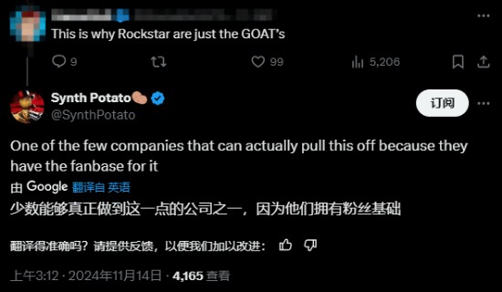 评论区有玩家感慨:“这就是为什么R星是GOAT。”SynthPotato也表示赞同:“R星是少数能真正做到这一点(靠粉丝传播消息)的公司之一,因为他们拥有庞大的粉丝基础。”