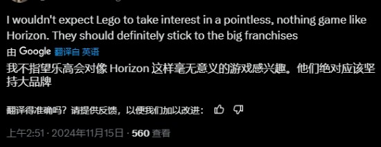 还有不少玩家都表示,这可能跟《地平线》这一IP有关:“《地平线》创造了一个机器恐龙世界,但不知何故却让它变得乏味又‘同性恋’。所以我对乐高版的它不感兴趣。”