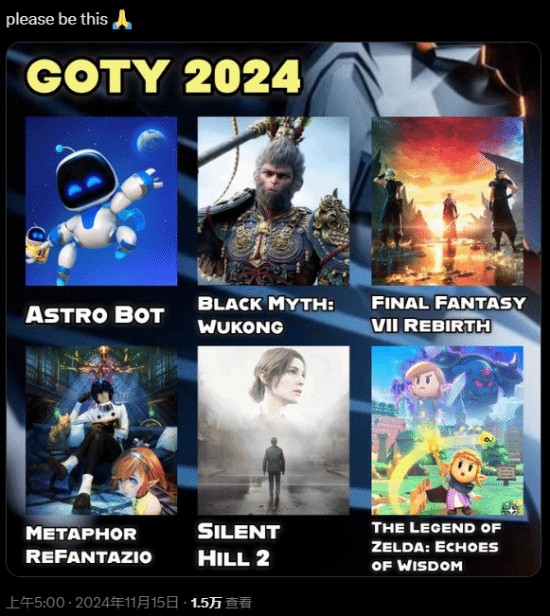 评论区下方大部分网友都将票投给了《黑神话:悟空》、《宇宙机器人》、《最终幻想7:重生》、《寂静岭2:重制版》《暗喻幻想》等作品,此外还有一些玩家认为《剑星》、《塞尔达传说:智慧的再现》等游戏同样具有竞争力。