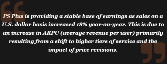 索尼表示:“PS Plus提供了稳定的盈利基础,按美元计算的销售额同比增长了18%。这主要是由于大多客户升级使用二三档服务以及价格上调的影响,用户平均支出明显上涨。”