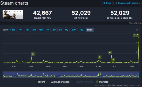据SteamDB数据显示,本次活动带动《半条命2》Steam在线人数走向新高,以5.2万人同时在线的优秀成绩打破了此前记录(此前最高为1.6万人)。