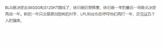 不少玩家都表示,BLG续约的话这个阵容还是非常有战斗力的,就像S6的SSG和S12时的SKT一样,重整旗鼓再冲一年,在第二年获得冠军。