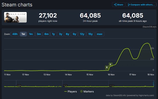 截至发稿前,据SteamDB数据显示,《半条命2》在Steam平台的玩家数量再次创下新高,达到了64085人,这对于一款已经发售了20年的游戏来说,数据十分出色。