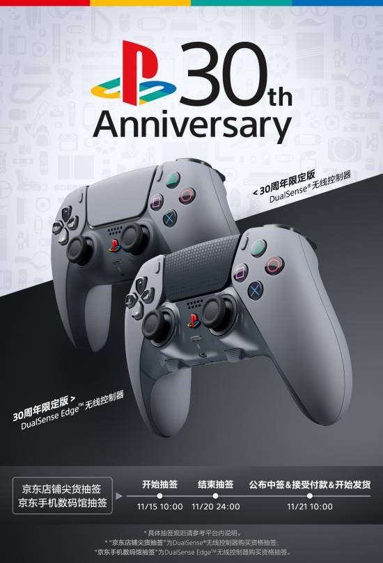 今日,30周年限定版DualSense®无线控制器和30周年限定版DualSense Edge™无线控制器购买资格抽签活动已开始,中签结果将在11月21日上午10:00公布,感兴趣的玩家可以去抽签了。
