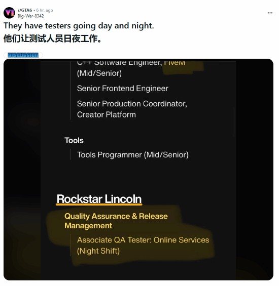 有玩家日前在R星官网的招聘信息处发现,R星林肯正在招聘与在线服务相关的助理QA测试员,工作时间为夜间。R星的这一举动让众多玩家围观,有玩家猜测,R星招聘夜班助理QA测试员的原因在于可以让第二天白班的员工修复Bug,提高制作效率。