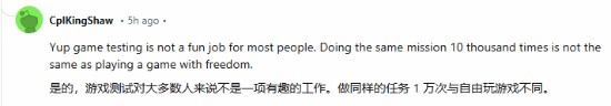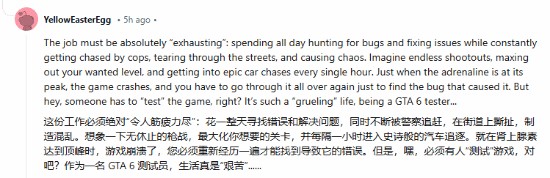 还有玩家称,R星这样做让自己增强了《GTA6》能在2025年发售的信心,且游戏质量能够更上一层楼。一些玩家表示想申请这份工作,但很快就被破了一盆冷水——因为这项测试工作会非常枯燥,应聘者将会一遍又一遍的做同样的事情。