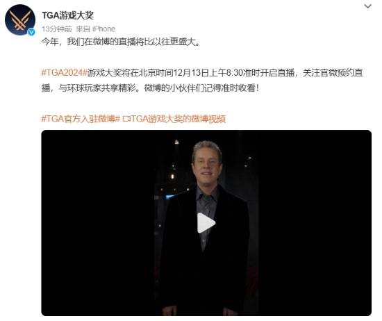 2024 TGA提名名单即将在明天正式公布,就在刚刚,TGA宣布入驻新浪微博,创始人兼主持人Geoff Keighley向中国玩家带来问候:今年,我们在微博的直播将比以往更盛大。TGA2024游戏大奖将在北京时间12月13日上午8:30准时开启直播,关注官微预约直播,与环球玩家共享精彩。微博的小伙伴们记得准时收看!