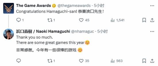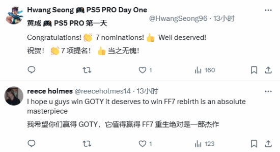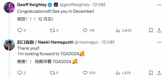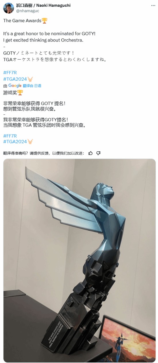 11月19日,游戏总监滨口直树发推晒出了2023年TGA《最终幻想7:重生》“最受期待游戏”奖杯,并表示:“我非常荣幸《最终幻想7:重生》能够获得今年TGA年度最佳提名!一想到TGA里的管弦乐团时我就很兴奋。”在评论区里,TGA官方、杰夫以及玩家们为其送上了祝贺。