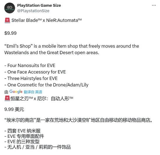 此前,《剑星》官方确认联动DLC为付费内容。而今晚数据挖掘博主@PlayStation Game Size 发推确认,DLC售价为9.99美元。据悉,其中会为女主伊芙带来尼尔主题的四套新衣服、一款专用面部配件、三种新发型、三款饰品。