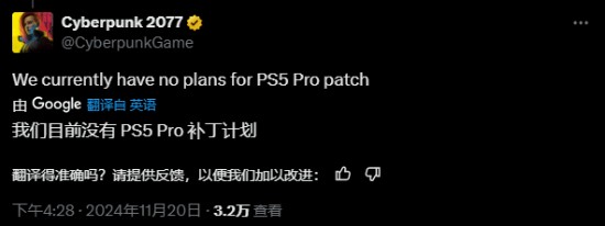 而就在近日,《赛博朋克2077》官方在推特回复玩家的评论时确认,目前本作并没有为PS5 Pro发布补丁的计划。