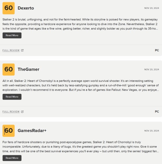 《潜行者2:切尔诺贝利之心》的媒体评测已经解禁,PC版收录18家媒体,均分77,Xbox版收录7家媒体,均分81分。其中有3家媒体为本作打出60分,以下为这三家媒体的评价。