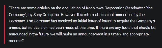 “关于索尼集团收购角川株式会社的报道近期频繁出现,但本公司并未公布该信息。本公司已收到收购公司股份的初步意向书,但目前尚未做出决定。如果将来有任何需要公布的事实,我们将及时、适当地发布公告。”