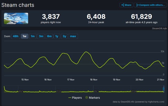 当然,目前正值《微软飞行模拟2024》的首发阶段,再加上之前提到的问题显然对游戏的表现造成了影响。随着补丁的逐步推出,在未来,玩家数量是否会显著增长,值得继续关注。