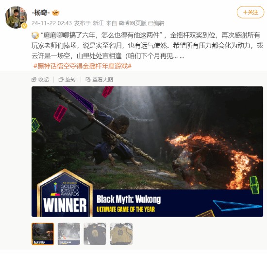 《黑神话》的主美杨奇也在获奖后发文:“磨磨唧唧搞了六年,怎么也得有他这两件” ,金摇杆双奖到位,再次感谢所有玩家老师们捧场,说是实至名归,也有运气使然。希望所有压力都会化为动力,拨云许是一场空,山里处处宜相逢(咱们下个月再见......