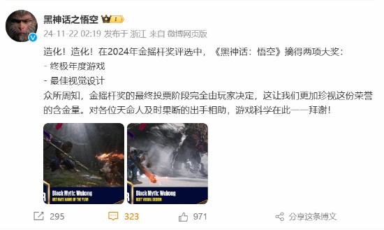 《黑神话:悟空》官方微博在获奖后发文表示:“造化!造化!在2024年金摇杆奖评选中,《黑神话:悟空》摘得两项大奖:终极年度游戏、最佳视觉设计。”