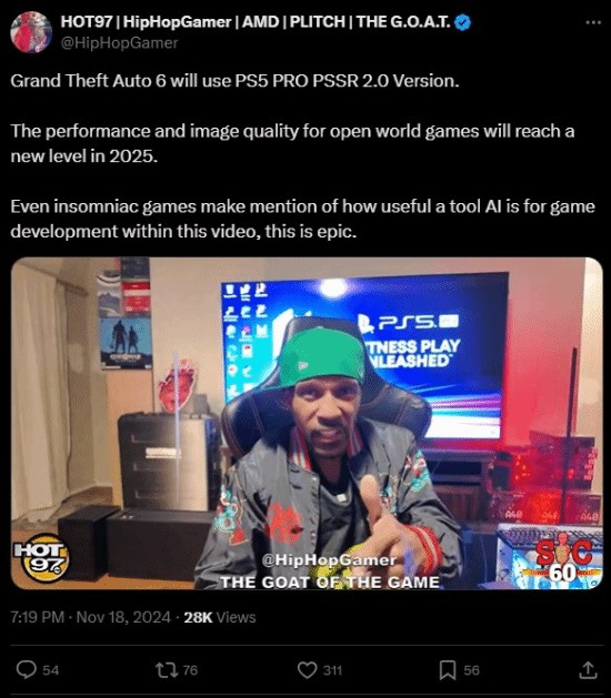 PS5 Pro上市后,玩家们也开始猜测新机对《GTA 6》将带来多大影响。知名爆料人HipHopGamer在社交媒体上透露《GTA 6》将利用一种名为“PSSR 2.0”的全新AI增强技术实现惊人的“图像重建”效果。这项技术被认为是PSSR的先进迭代版本,能够为游戏提供更高的视觉效果,同时保持优秀的性能表现。