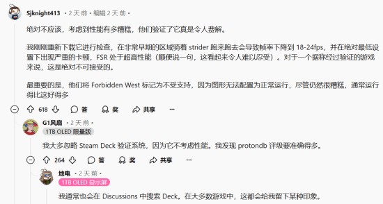 Reddit论坛有玩家发帖称,《地平线:零之曙光复刻版》的性能真的很差,绝对不应该获得SteamDeck可玩认证,V社到底是怎么验证的?游戏前期骑着strider(机械兽之一)时,画面设置最低且开着最高档FSR的情况下,即使画面看着非常难以接受,还是会让帧率下降到18-24帧。这对于经过可玩验证的游戏来说,是绝对不能接受的。