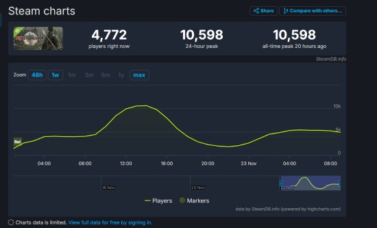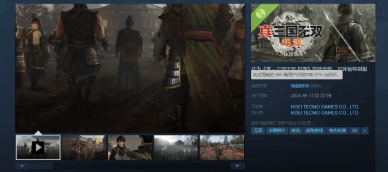 本试玩版目前Steam历史在线人数峰值已突破10000人,Steam商店页面共收获了965篇评测,好评率为87%(特别好评)。