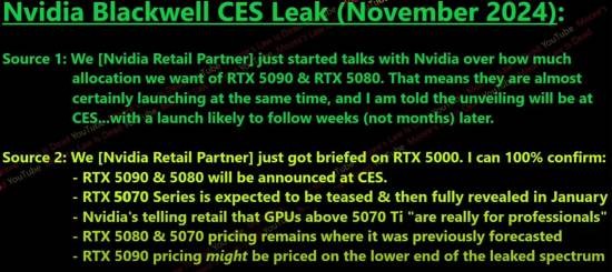 消息源透露英伟达计划在 CES 大展上宣布 RTX 5080 和 RTX 5090 两块显卡,并会预告 RTX 5070 和 RTX 5070 Ti 两块显卡,可能会在 1 月发布。