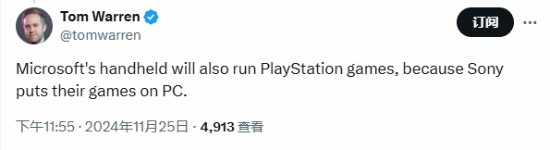据外媒gamerant报道,业内人士Tom Warren日前也报道了索尼PS新掌机的消息,在回应一位玩家的推文时,Tom Warren表示:“微软的掌机也能运行PS游戏,因为索尼已经把自己的游戏带入到了PC平台。”
