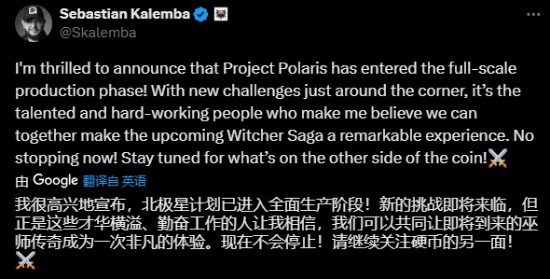 CD Projekt RED副总裁兼游戏总监Sebastian Kalemba今天在推特发文宣布,《巫师4》项目“北极星”现已结束了前期制作,正式进入全面制作阶段!他对这款新作充满信心,表示将为粉丝带来一段非凡的体验。