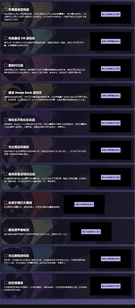 与此同时,Steam大奖游戏提名投票通道开启。本届共开设11个奖项,包括年度最佳游戏奖、年度最佳 VR 游戏奖、爱的付出奖、最佳 Steam Deck 游戏奖、独乐乐不如众乐乐奖、杰出视觉风格奖、最具创意游戏玩法奖、纵使手残仍大爱奖、最佳原声音轨奖、杰出剧情游戏奖、轻松惬意奖。