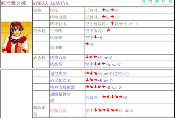 超必杀技:通常需要输入连续方向指令后再按两个攻击键(AC 或 BD)
