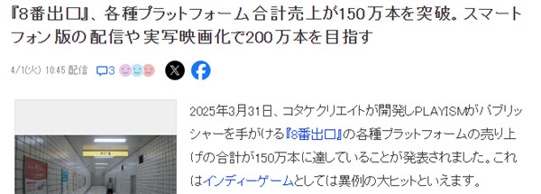 随着手游版的上线以及电影化进程的推进,8番出口的热度仍在持续攀升,预计其销量很快将突破200万大关,成为独立游戏市场中又一现象级作品。