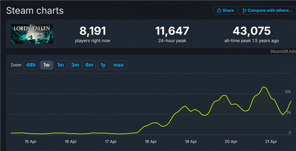 凭借本次内容丰富、诚意十足的大型更新,堕落之主在Steam平台上的热度迅速攀升,其24小时内的同时在线玩家数飙升至11647人,成功打破此前低迷局面。相比更新前仅有554名同时在线玩家的状态,这一数据增长超过21倍,足见此次更新所带来的巨大影响力,也反映出玩家社群的强烈反响与热情回归。