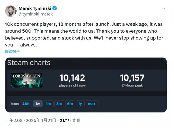 值得一提的是,开发商CI Games的首席执行官Marek Tyminski也在第一时间通过社交平台X发文表达了激动之情。他在推文中表示,非常感激所有玩家在过去18个月里对堕落之主的支持与坚持。